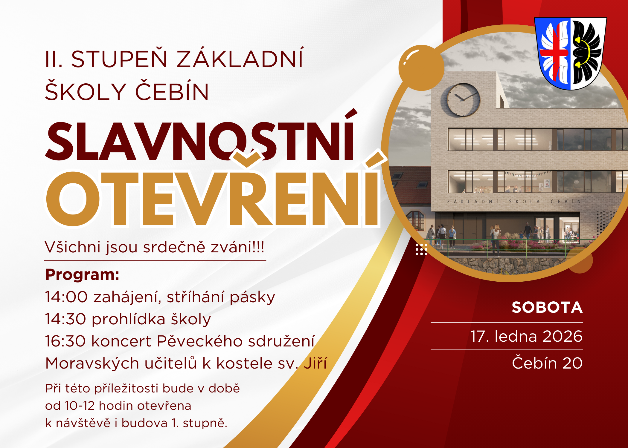 Obec Čebín a Základní škola Čebín zvou všechny na slavnostní otevření nové školy. Slavnostní otevření se uskuteční v sobotu 17. ledna, ve 14 hodin.